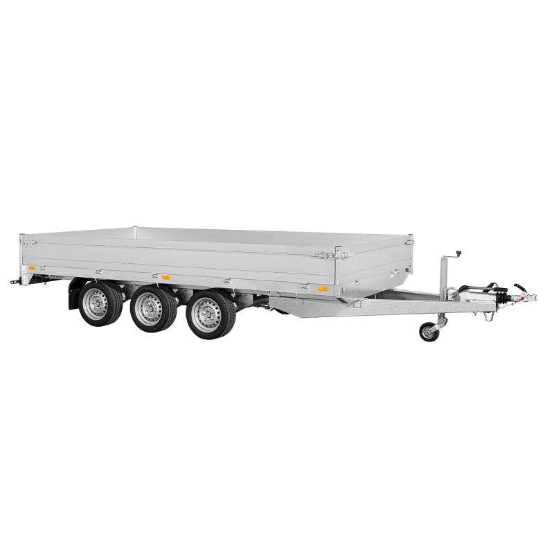 Remorque plateau robuste avec châssis soudé et ridelles en aluminium double paroi. Facile à déplacer grâce à la roue jockey escamotable sur-dimensionnée. Seuil de chargement surbaissé, châssis anti-torsion, ridelles de 35 cm avec fermeture extérieure. Crochets arrimage anti-bruit, ergots de sanglage et de fixation des filets inclus. Options disponibles : rampes, treuil, béquilles, amortisseurs d’essieu, plancher en tôle d’acier, roue de secours, éclairage LED. Galvanisation complète pour une durabilité maximale. Livret d’instruction/d’entretien inclus.